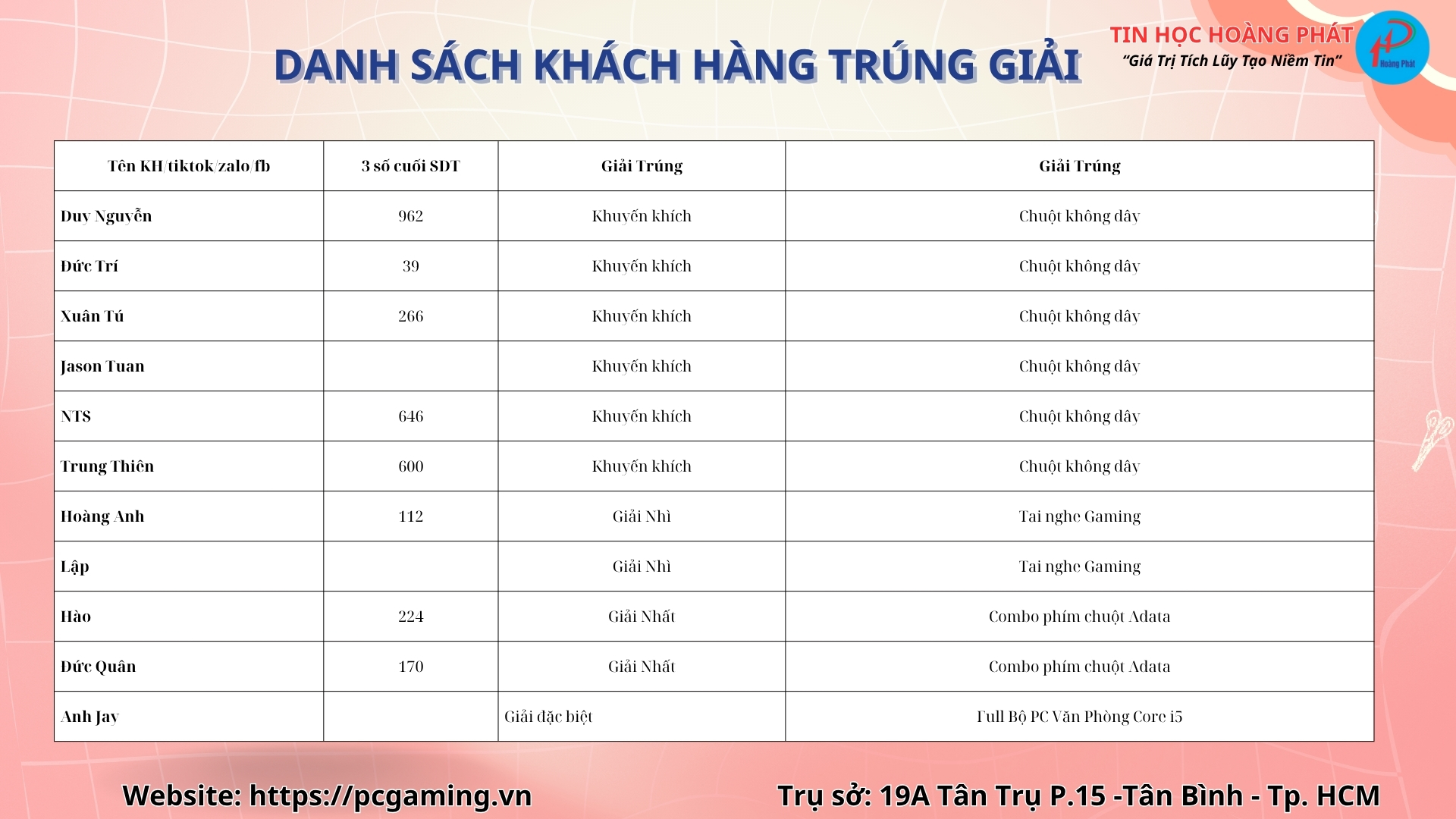 Danh sách người trúng thưởng đã được Tin Học Hoàng Phát công bố công khai trên website chính thức 👉 pcgaming.vn, đảm bảo tính minh bạch và công bằng tuyệt đối.